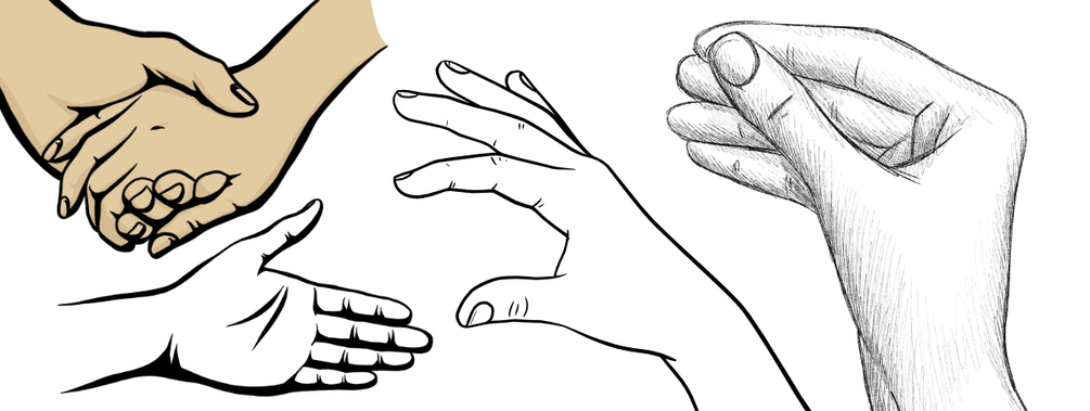 Hochauflösende Zeichnungen (300dpi) von Händen in unterschiedlichen Positionen, Formaten und in unterschiedlichen Stilen: